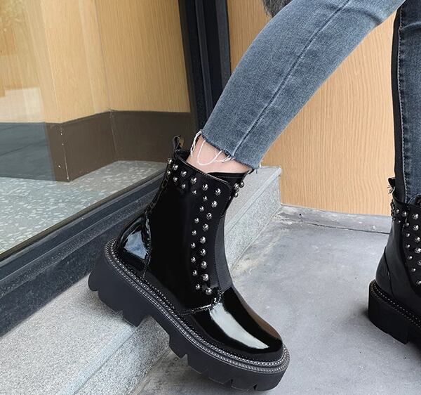 レディース ブーツ ショートブーツ 太ヒール ミドルヒール 厚底 5.5㎝ ラウンドトゥ 防水性 滑り止め 異国風 スタッズ 革 レザー カジュアル おしゃれ かっこいい エレガント ボーイッシュ クール 存在感 シック スタイリッシュ 高級感 ロック 秋 冬 デート お出かけ 休日 デイリー 普段使い 高見え スタイルアップ効果 22.5cm 23.0cm 23.5cm 24.0cm 24.5cm 25.0cm 25.5cm 26.0cm 22.0㎝ 小さいサイズ 26.5㎝ 大きいサイズ ブラック