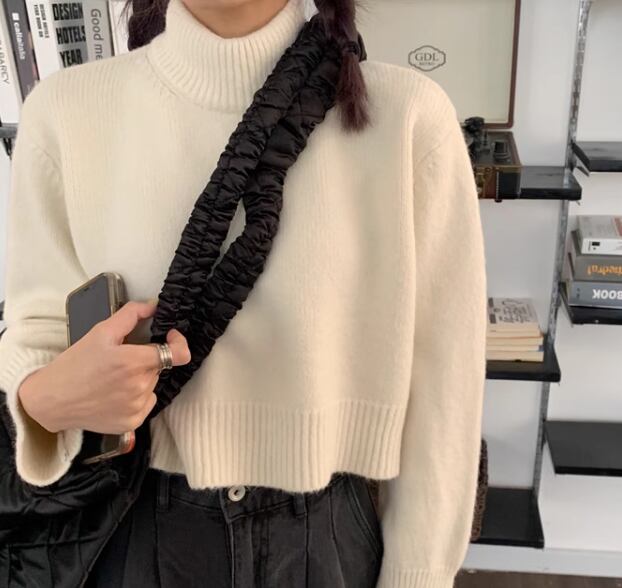 短めの丈感が今っぽくて可愛い長袖のニットセーター。厚手の生地はとても暖かく、秋から冬にかけての寒い季節に重宝します。シンプルなので着回し力抜群。ハイウエストのボトムスを合わせるとトレンド感が増して◎
